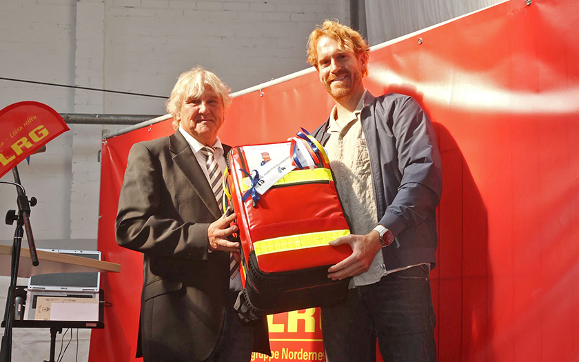 Mit einem besonderen Geschenk ehrte die Bürgerstiftung Norderney die Arbeit der DLRG-Ortsgruppe: Auf der Jubiläumsfeier zum 75-jährigen Bestehen überreichte der Vorstand der Bürgerstiftung durch Felix Wolters am 7. September in der Bootshalle im Jachthafen einen neuen Sanitätsrucksack im Wert von 450 Euro zum Festtag. „Das ist kein Pflasterkasten“, freut sich Jörg Kampfer, zweiter Vorsitzender und Leiter Einsatz, nach der Übergabe: „Dieser dritte Sanitätsrucksack ist für uns sehr wertvoll.“