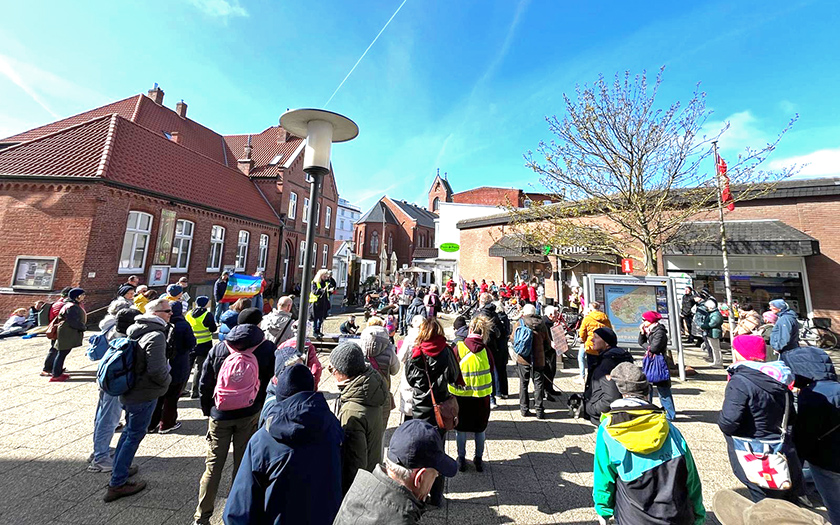 Bei strahlendem Sonnenschein haben sich um 11.30 Uhr rund 100 Menschen in der Poststraße zu einer Friedenskundgebung versammelt. Sie waren damit dem Aufruf der Friedensinitiative Norderney gefolgt. Aus der Mitte der Veranstaltung meldeten sich mehrere Redner und Rednerinnen mit kurzen Beiträgen und Zitaten zum Frieden zu Wort und stimmten gemeinsam ein Friedenslied an. Der Norderneyer Posaunenchor begleitete die halbstündige Aktion musikalisch. Zum Abschluss schwiegen die Teilnehmenden um 12 Uhr während des Glockengeläuts fünf Minuten.