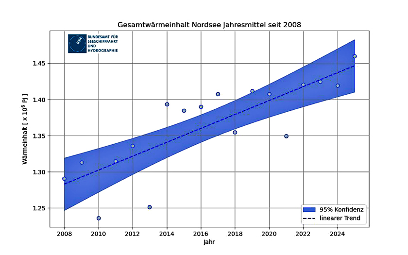 Doch nicht nur an der Oberfläche, sondern auch in der Tiefe bis zum Meeresboden hat sich das Meerwasser erwärmt, wie die Ergebnisse des BSH zeigen: „2025 speicherte die Nordsee mit 1,46 Millionen Petajoule so viel Wärme wie nie zuvor, etwa 35.000 Petajoule mehr als im Vorjahr. Diese Differenz entspricht etwa dem Dreifachen des deutschen Primärenergieverbrauchs in 2024. Besonders von April bis September erreichte der Wärmeinhalt neue Rekorde.“