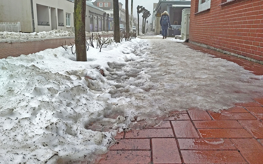 Mit dem Wochenstart setzte das Tauwetter ein und die Gefahr gebannt, auf verschneiten oder überfrorenen Gehwegen auszurutschen. Umso deutlicher zeigte sich jedoch auch, vor welchen Häusern in den vergangenen Tagen kein oder nur unzureichender Winterdienst geleistet wurde. „Unsere Mitarbeiter im Außendienst sind unterwegs und machen Feststellungen“, sagte dazu Jürgen Vißer, Leiter des Fachbereichs Bürgerdienste der Stadt Norderney, zu dem auch das Ordnungsamt gehört, dem Norderneyer Morgen. Den vergangenen Freitag, an dem der Schneesturm über die Insel zog, könne man noch beiseite lassen, „aber wer bis jetzt nichts gemacht hat, der darf sich nicht wundern, wenn er von uns Post bekommt.“ Auch die Tage zuvor habe das Ordnungsamt bereits die Gehwegsituation im Blick gehabt, so Vißer.
